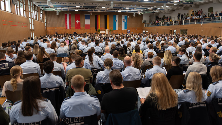 Am heutigen Donnerstag, 26. September 2024, fand in der Sporthalle des Campus Villingen-Schwenningen die Verabschiedung des 2. Studienjahrgangs im Polizeistudium im Ausbildungsdienst – Schutzpolizei statt. Der Studiengang wird auch als erfahrungsbasierter Studiengang bezeichnet. In ihm studieren Polizeibeamtinnen und Polizeibeamte, die bereits ihre Ausbildung zum mittleren Polizeivollzgsdienst absolviert und eine geraume Zeit Praxiserfahrung gesammelt haben.