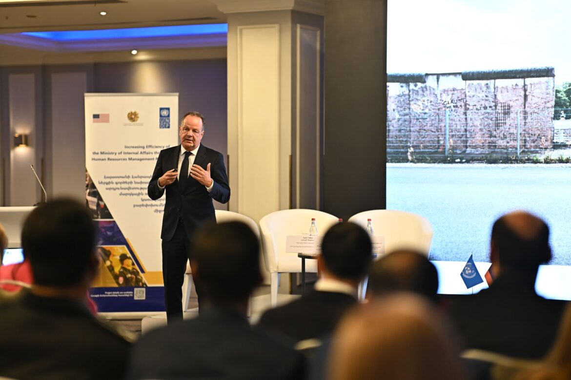 Im Rahmen einer von den Vereinten Nationen organisierten internationalen Fachkonferenz in Jerewan, Armenien präsentierte Herr Zeiser die Ansätze der Polizei Baden-Württemberg zur kompetenzbasierten Auswahl und Ausbildung von Polizeibeamtinnen und -beamten. Die eintägige Veranstaltung brachte europäische Expertinnen und Experten mit Vertreterinnen und Vertretern des armenischen Innenministeriums zusammen, um moderne Verfahren des Personalmanagements in der armenischen Polizei zu diskutieren.