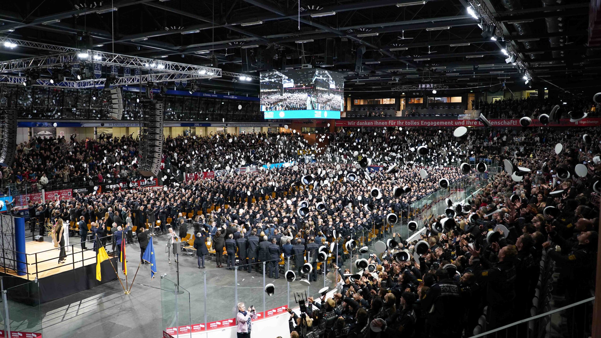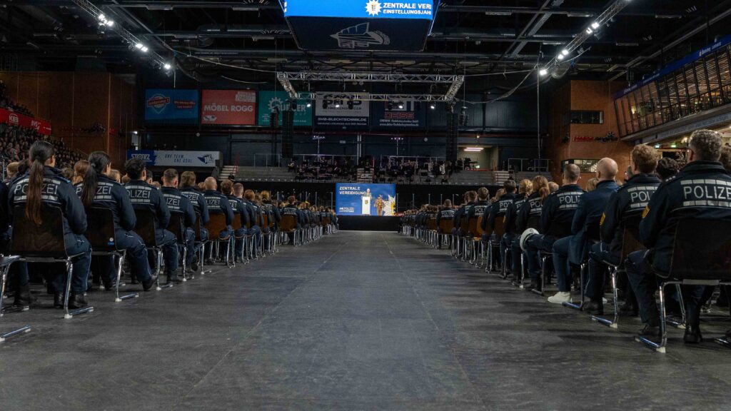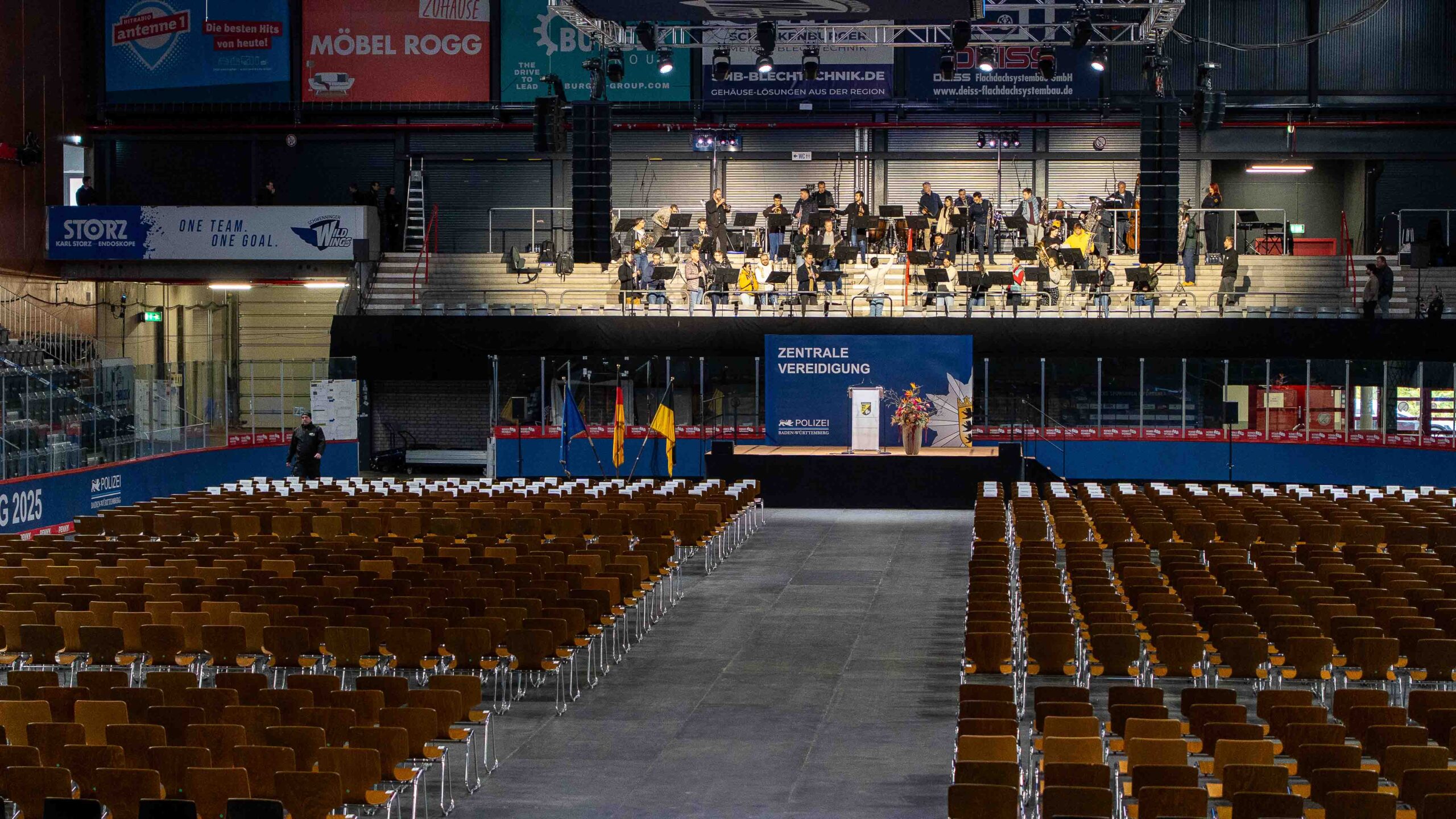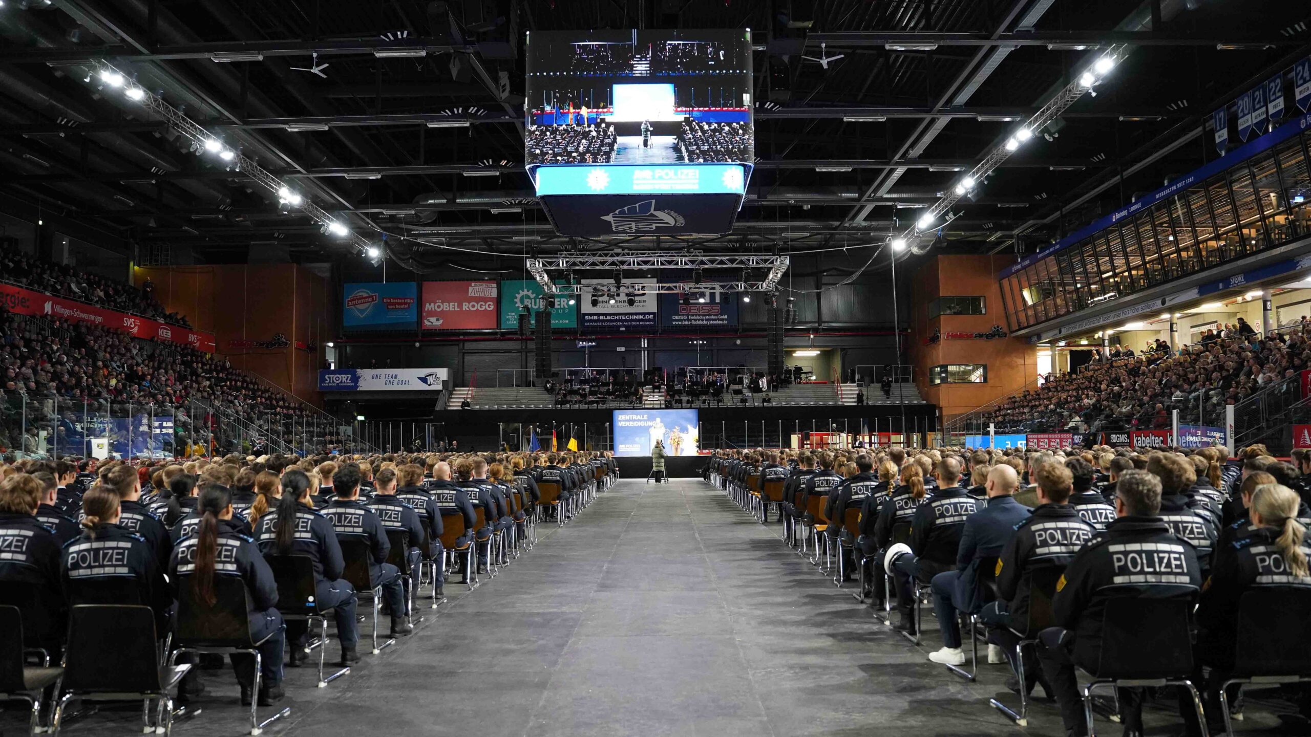 Am 17.10.2025 findet in der Helios Arena in Villingen-Schwenningen die erste Zentrale Vereidigung eines gesamten Einstellungsjahrgangs der Polizei Baden-Württemberg statt. Rund 1.200 Polizeibeamtinnen und Polizeibeamten des Einstellungsjahrgangs 2025 werden gemeinsam ihren Diensteid ablegen.