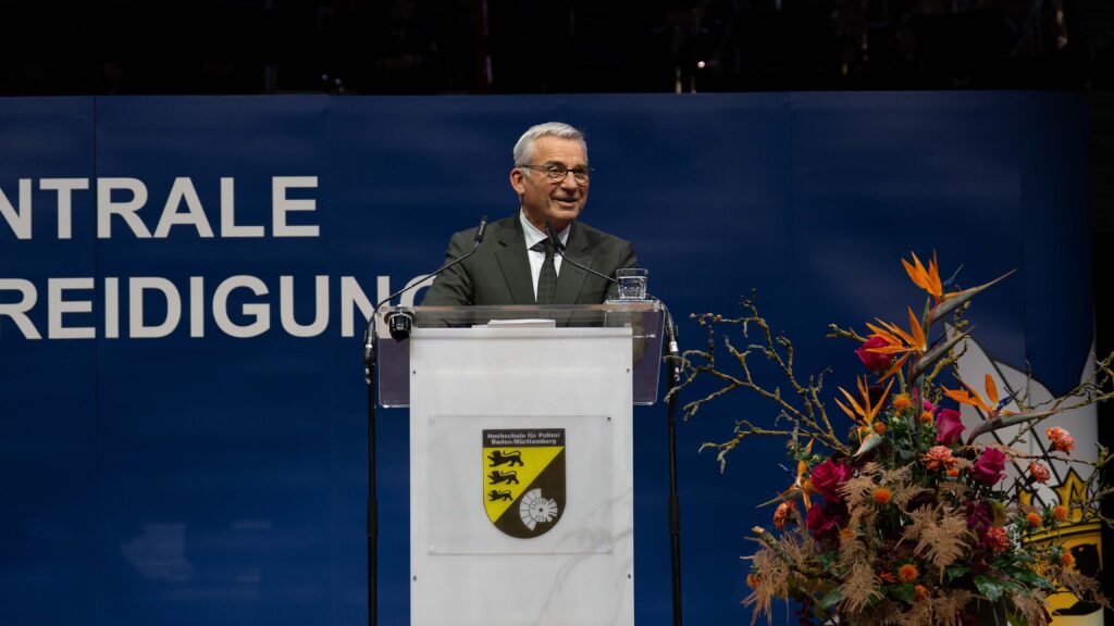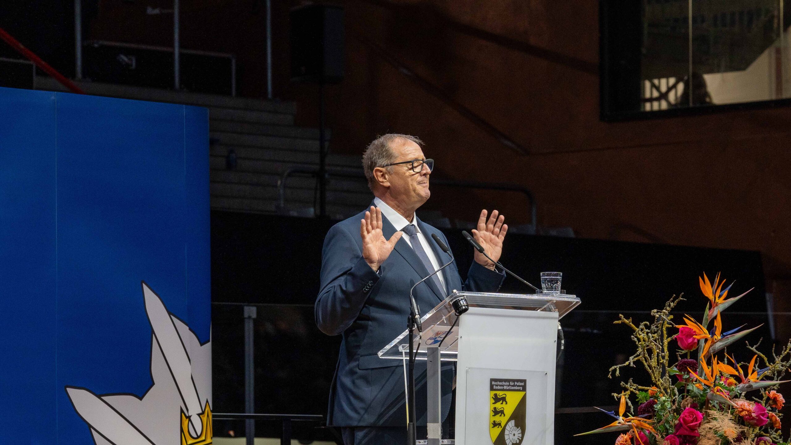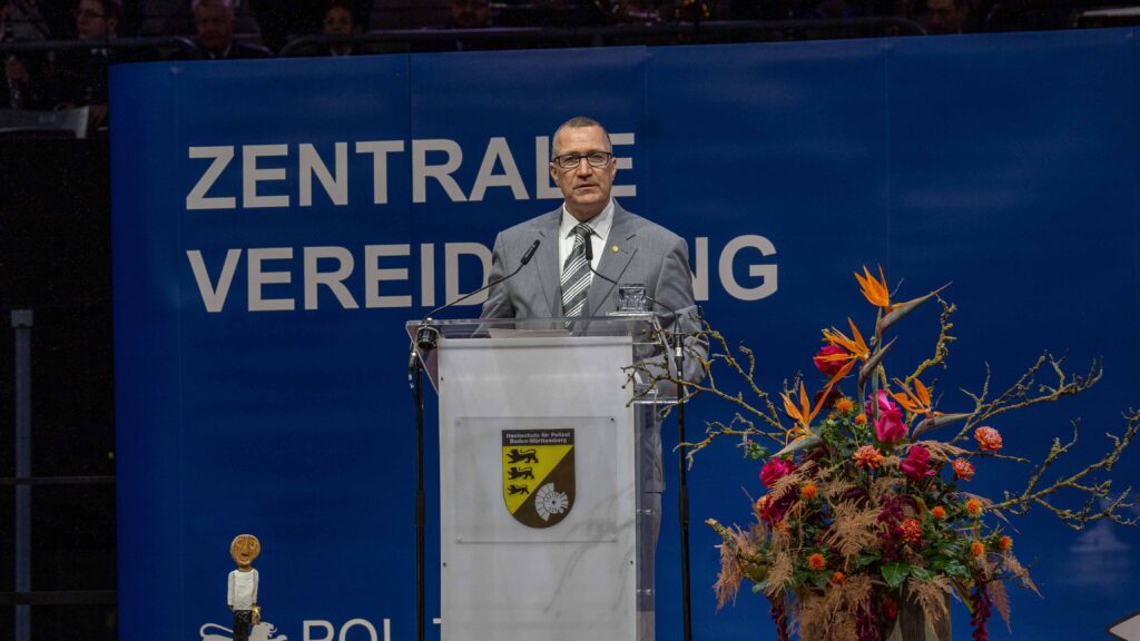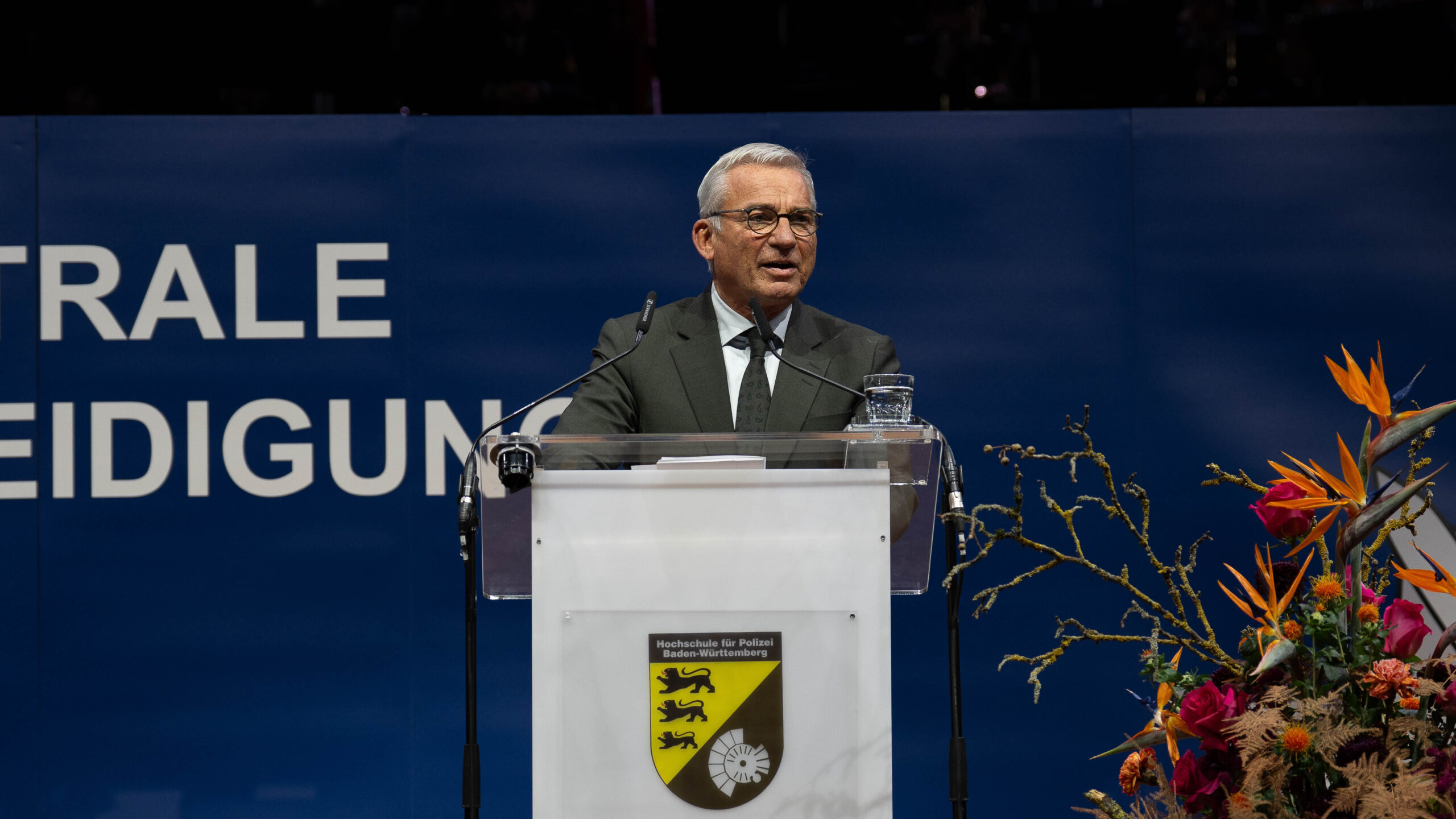 Im Anschluss übergab er das Wort an Landespolizeidirektor Norbert Schneider vom Ministerium des Inneren, für Digitalisierung und Kommunen Baden-Württemberg. Er ging auf die größte Einstellungsoffensive der Polizei Baden-Württemberg ein, die seit 2016 erst möglich gemacht habe, dass so viele Menschen bei der Polizei eingestellt werden konnten und studieren können. Auch er beglückwünschte alle Studierenden und wünschte ihnen alles Gute für den weiteren Weg bei innerhalb der Polizei, der so viele Möglichkeiten wie kaum ein anderer Beruf biete.