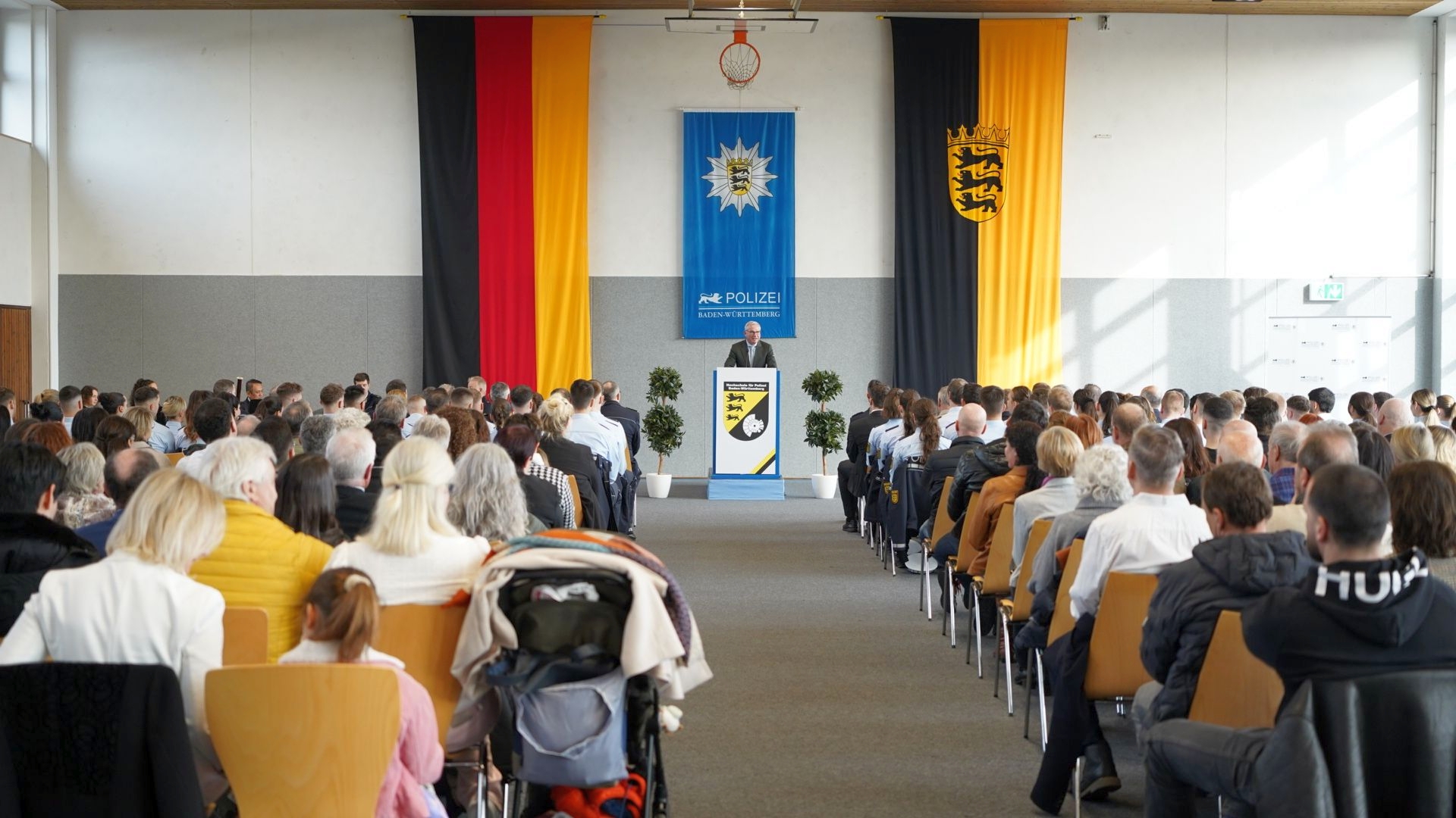 Vom 20.02.2025 bis 26.02.2025 wurden an den fünf Institutsbereichen Ausbildung (IBA) der Hochschule für Polizei Baden-Württemberg insgesamt 316 frisch ausgebildete Kolleginnen und Kollegen verabschiedet. Nach zweieinhalbjähriger erfolgreich absolvierter Ausbildung sind sie nun Polizeiobermeisterinnen und Polizeiobermeister und verrichten seit dem 01.03.2025 ihren Dienst bei den regionalen Polizeipräsidien oder dem Polizeipräsidium Einsatz.